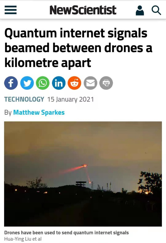英国的《新科学家》杂志则评价,在这个工作中,人们首次实现了移动节点间自由空间量子链路的搭建,作者援引伦敦帝国理工学院Myungshik Kim的评论指出:“将如此复杂的光学器件集成进移动的无人机,移动过程中实现量子连接,这无疑增加了实现难度,这是一项大的技术进步。