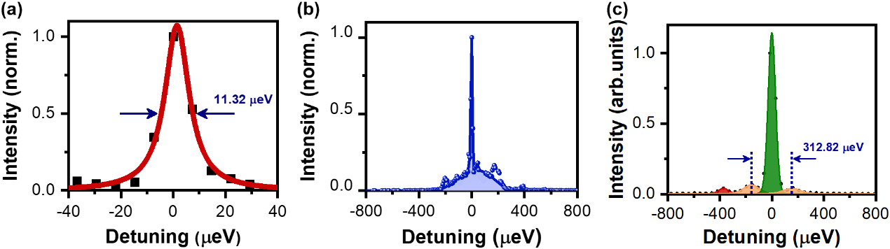 2 (a) 激光能量在小范围内扫描对单个CsPbI3纳米晶的激子发射态进行激发,得到半宽为~11.32 ?eV的荧光激发光谱。(b) 激光能量在大范围内扫描对单个CsPbI3纳米晶的激子发射态进行激发,可以在其荧光激发光谱的低能端和高能端观察到连续分布的声学声子模式。 (c) 激光能量与单个CsPbI3纳米晶的高能激子发射态共振时,可以在其荧光光谱(绿色)的低能端和高能端分辨出能量为~150 ?eV的分立声学声子模式(橙色),以及声子辅助下激子跃迁到低能发射态所产生的荧光峰(红色)。
