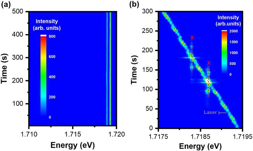 1 (a) He-Ne激光器1.96 eV激发下单个CsPbI3纳米晶激子发射双峰能量位置和荧光强度随时间的稳定演化图像。 (b) 半导体激光器在1.7175-1.7195 eV范围内进行精细扫描时,该纳米激子发射双峰X的荧光强度随时间演化图像