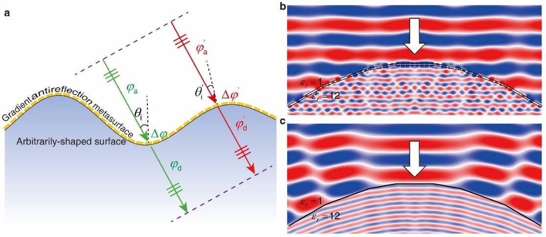 这种基于梯度减反超表面让材料表面“消失”的原理并不只适用于平面。理论上,可以利用这一原理让具有任意形状的材料表面“消失”。作者基于费马原理以及相位补偿原理,得到了让任意形状的曲面“消失”所需要的透射相位分布(图3a),并且针对介电常数为12的电介质的一个弧形曲面设计了一个例子。数值仿真的结果表明梯度减反超表面确实可以让这个高折射率介质的突起表面“消失”(图3b)。如果没有超表面,这个突起会导致明显的反射和折射效果(图3c)。