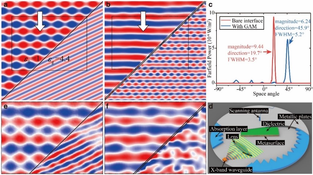 要让材料表面“消失”,需要超表面同时具有减反和波前调控两种功能。也就是说,超表面的结构单元不仅能在高折射率材料表面实现高透射,还要具备可在(0,2π)范围内任意调节的透射相位。作者采用了如图1c所示多层金属结构来设计单元结构,成功设计了五个减反单元,其透射率接近于100%,透射相位等间隔地覆盖π/2的范围(图1d)。将这五个单元顺序排列构成一个周期排布,构成了一个梯度减反超表面。数值仿真和微波实验测量的结果都表明,该超表面可以消除45°斜入射的电磁波在两侧介电常数分别为1和4.4的界面上的反射和折射(图2),从而让这种电介质表面“消失”或被“隐身”。