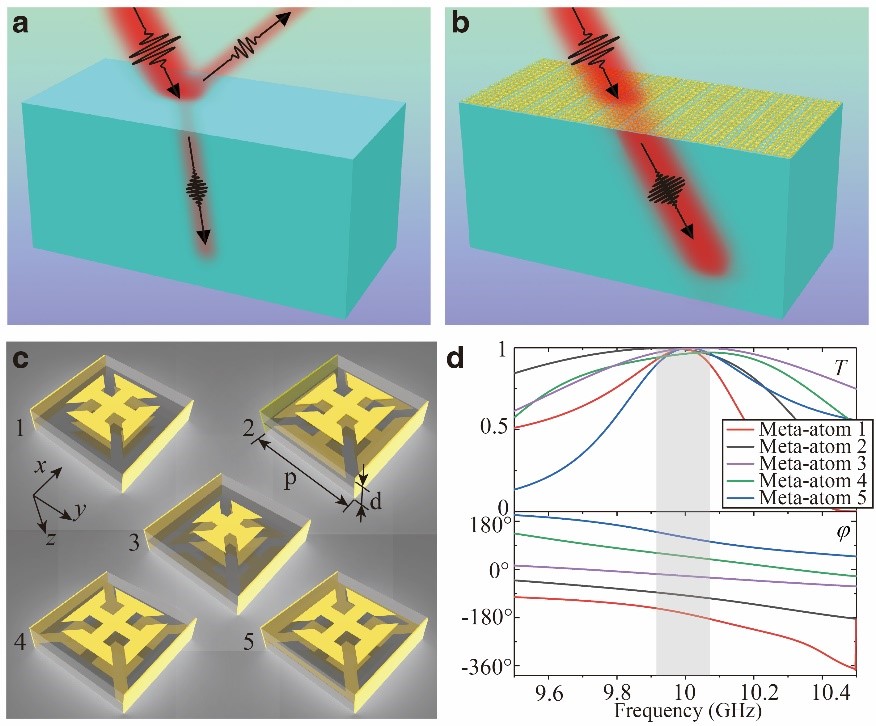 任何一个普通电介质材料的表面都存在反射和折射这两种基本的光学现象,如图1a所示。反射削弱了透射波的能量,而折射改变了透射波的传播方向。近期,凯发k8官网物理学院的褚宏晨助理研究员、赖耘教授、彭茹雯教授、王牧教授,以及伦敦大学玛丽女王学院的Yang Hao教授合作,首次将减反功能和波前调控功能在深度亚波长尺度(1/15λ)下融合,提出了一种梯度减反超表面(Nat. Comm. 12, 4523 (2021))通过在材料表面铺设一层超表面,不仅消除反射,还把透射波弯折回原来的入射传播方向(图1b)。也就是说,既没有反射,也没有折射,电磁波会径直沿入射方向穿过材料表面,就好像材料表面 “消失”了一样。文章通过数值仿真和微波实验验证了这个现象。