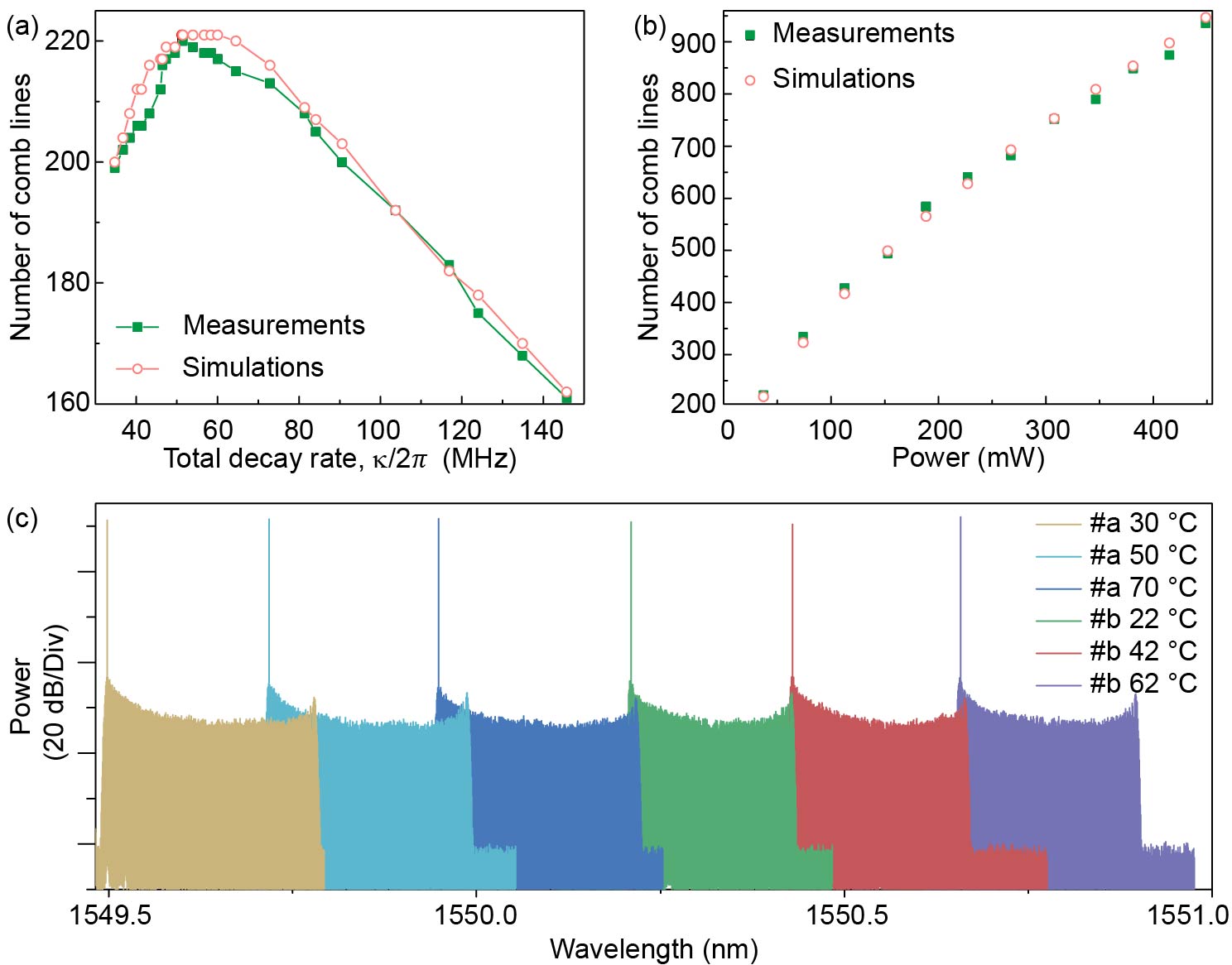 图3(a)梳齿数随耦合强度的变化。(b)梳齿数随泵浦功率的变化。(c)频率灵活的微腔光频梳谱。