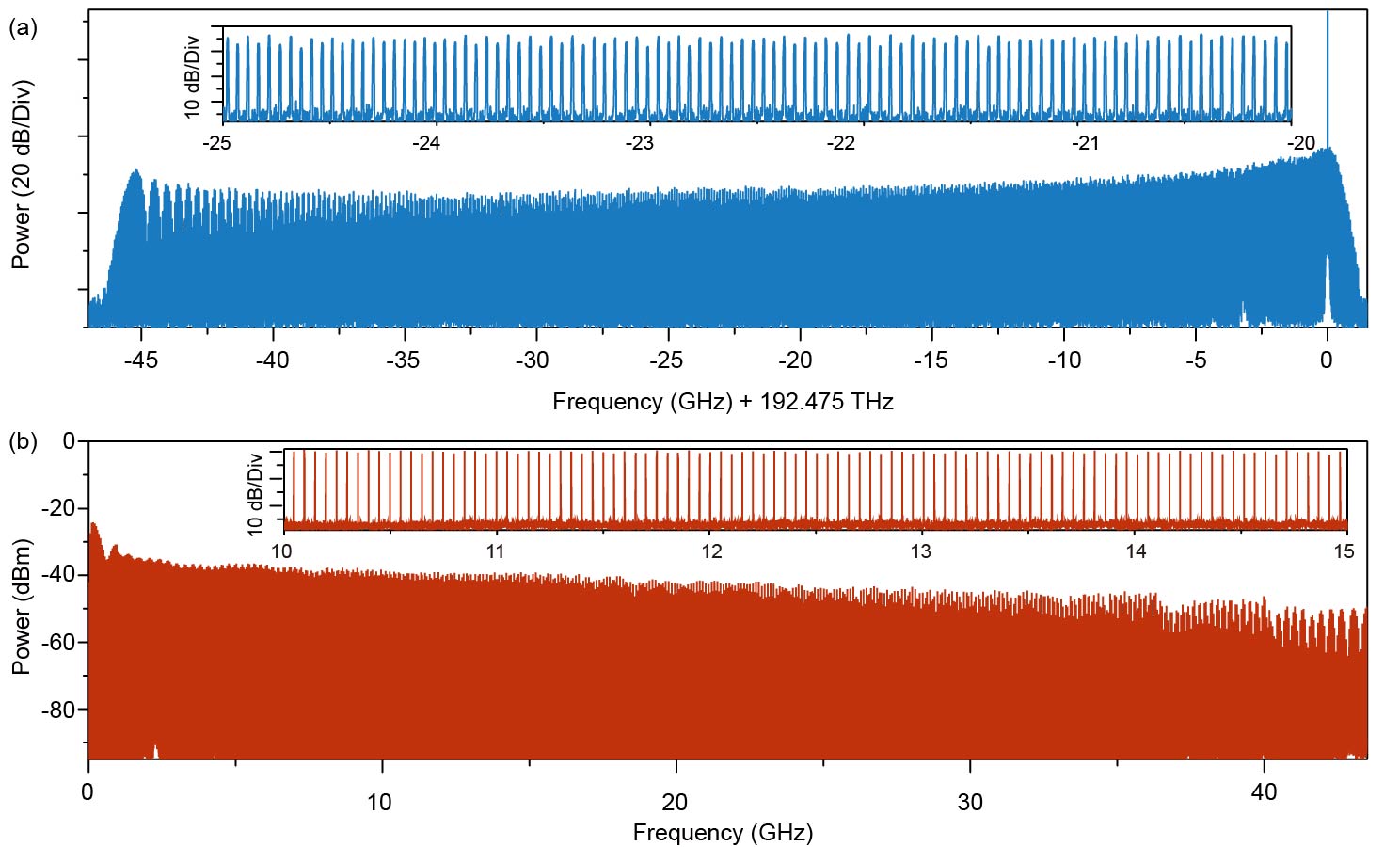 实验上,研究团队利用直径仅为60μm的回音壁模光学微腔,实现了重复频率为50.22 MHz,梳齿数达到938根的片上微型光频梳(见图2(a))。这种光力光频梳的重复频率等于光力振荡频率而不受限于光学微腔的自由光谱范围,成功突破了微腔几何尺寸对微腔光频梳重复频率的限制。基于这种光力光学频率梳光谱平坦的特点,研究团队还进一步实现了宽频谱(带宽>40 GHz)、梳齿平坦且梳齿线宽窄的微波频率梳(见图2(b)),该微波频率梳在微波通信、微波雷达以及任意波信号产生等方面具有潜在的应用价值。