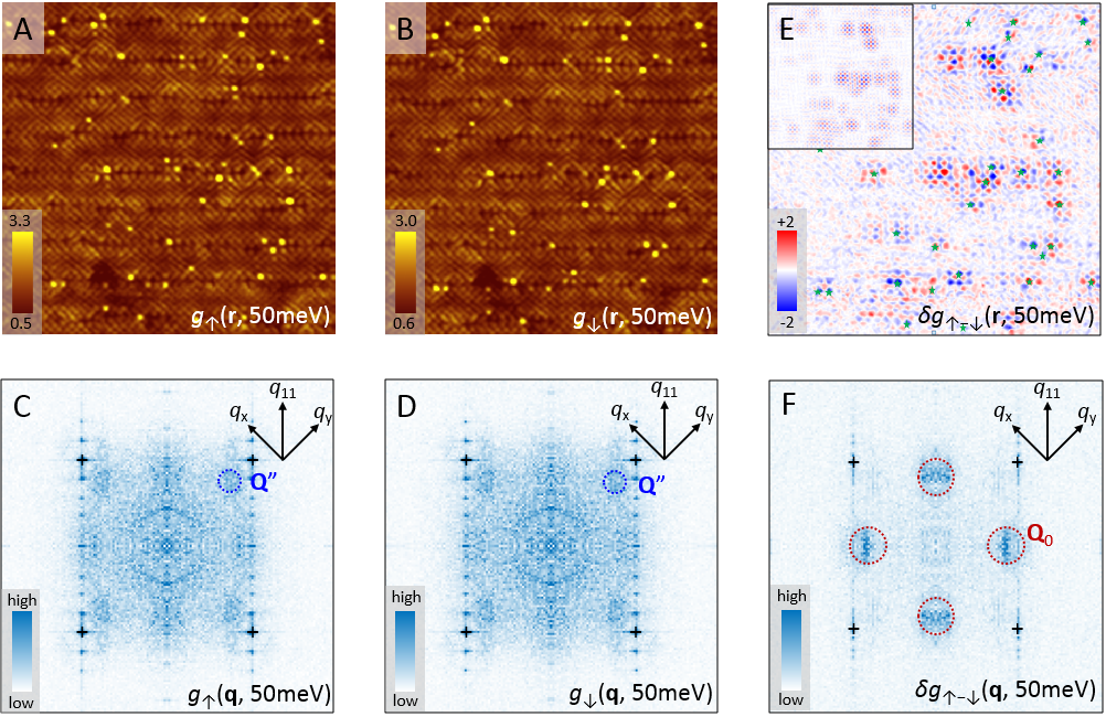 图1 (A,B) 用正负磁场极化针尖得到的准粒子相干散射图谱,它们傅立叶变换后的强度图如(C,D)所示。(E) A、B两图相减得到的自旋分辨的准粒子相干散射图,在Fe原子所在位置(绿色五角星)附近出现正负交替的反铁磁斑纹。(F)对E进行傅立叶变换后的强度图,C、D中电荷调制的散射斑纹Q"消失,而新出现了反铁磁的散射斑纹Q0。