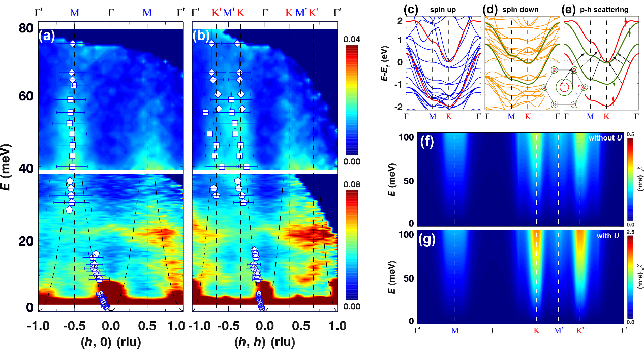 图1. (a)和(b) 非弹性中子散射测得的4 K温度下的自旋激发谱。(c)和(d) 密度泛函理论计算给出的铁磁态自旋向上向下电子能带结构。(e) 紧束缚模型计算结果以及粒子-空穴对散射过程示意。(f)和(g) 无规相近似计算得到的自旋激发谱。