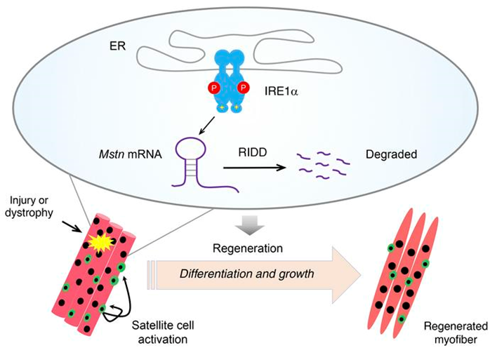2021年9月1日,甘振继教授团队与武汉大学刘勇教授团队合作,揭示了骨骼肌中内质网未折叠蛋白应激通路调控肌肉生长抑制素(MSTN)mRNA降解影响骨骼肌再生过程,在肌肉损伤修复与肌萎缩疾病的发生发展中发挥重要的功能。