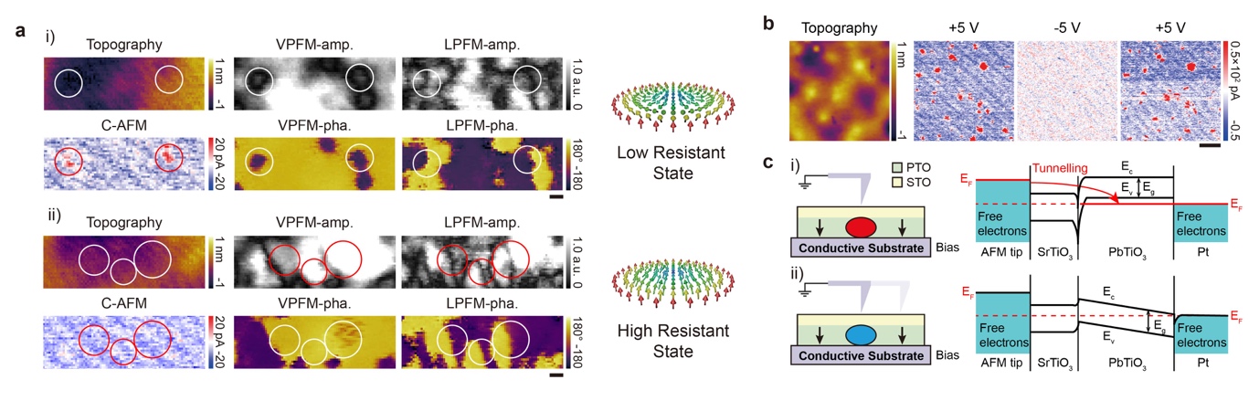 图2 自支撑氧化物双层结构中极性拓扑纳米畴的可逆阻态调控。(a)在+5 V i) 和-5 V ii) 扫描后在同一区域的形貌、VPFM/LPFM及CAFM图像。(b)施加+5 V和-5 V偏置电压可以实现在低阻态中心发散型纳米畴和高阻态中心会聚型纳米畴之间可逆切换。(c)两种不同类型拓扑结构的能带示意图。