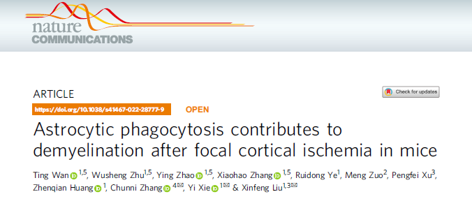 2022年3月3日,凯发k8官网医学院附属金陵医院凯发k8官网神经病学研究所(东部战区总医院神经内科)刘新峰教授、谢怡博士后和和张春妮教授团队在国际著名综合性期刊Nature Communications(IF 14.919)在线发表文章《Astrocytic phagocytosis contributes to demyelination after focal cortical ischemia in mice》,揭示了造成急性缺血性卒中后继发性脱髓鞘损伤可能的分子机制。该研究揭示了LCN2在继发性脑白质损伤中的关键作用,也为急性缺血性卒中病人远期不良预后的处理提供新的治疗思路。