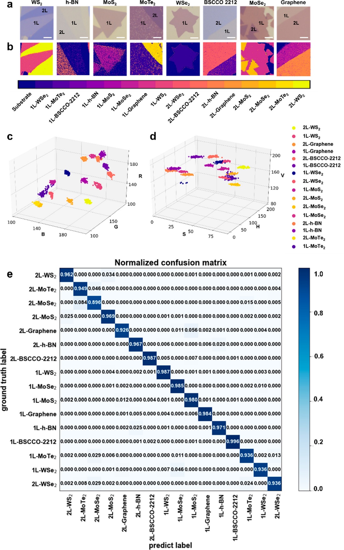 图2 利用人工神经网络算法对二维材料进行识别。(a)用于测试的OM图片;(b)预测的结果以及颜色标尺;(c)材料的RGB空间分布;(d)材料的HSV空间分布