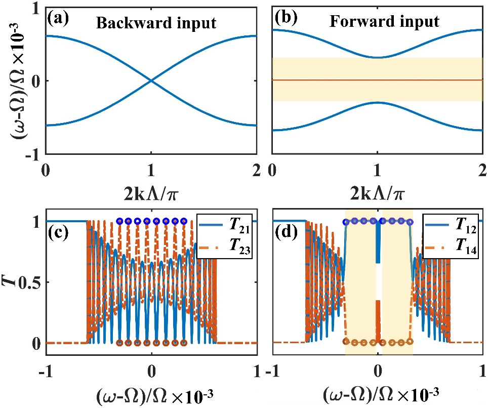 3 (a, b)非互易单光子带隙,其中(a)对应反向激发,(b)对应正向激发;(c, d) 非互易透射谱。