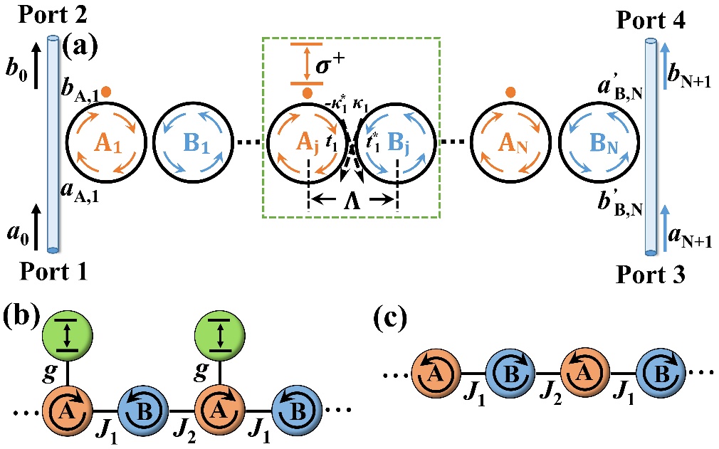 1 (a) 手性QE-CROW系统示意图。箭头表示对于13端口输入(正向入射)的回音壁模式传播方向。24端口输入(反向入射)激发相反的传播模式。具有极化跃迁的QEs周期性耦合A子晶格的顺时针模式。(b) 正向入射情况下表现L型三聚体链特征(c) 反向入射情况下表现二聚体链特征