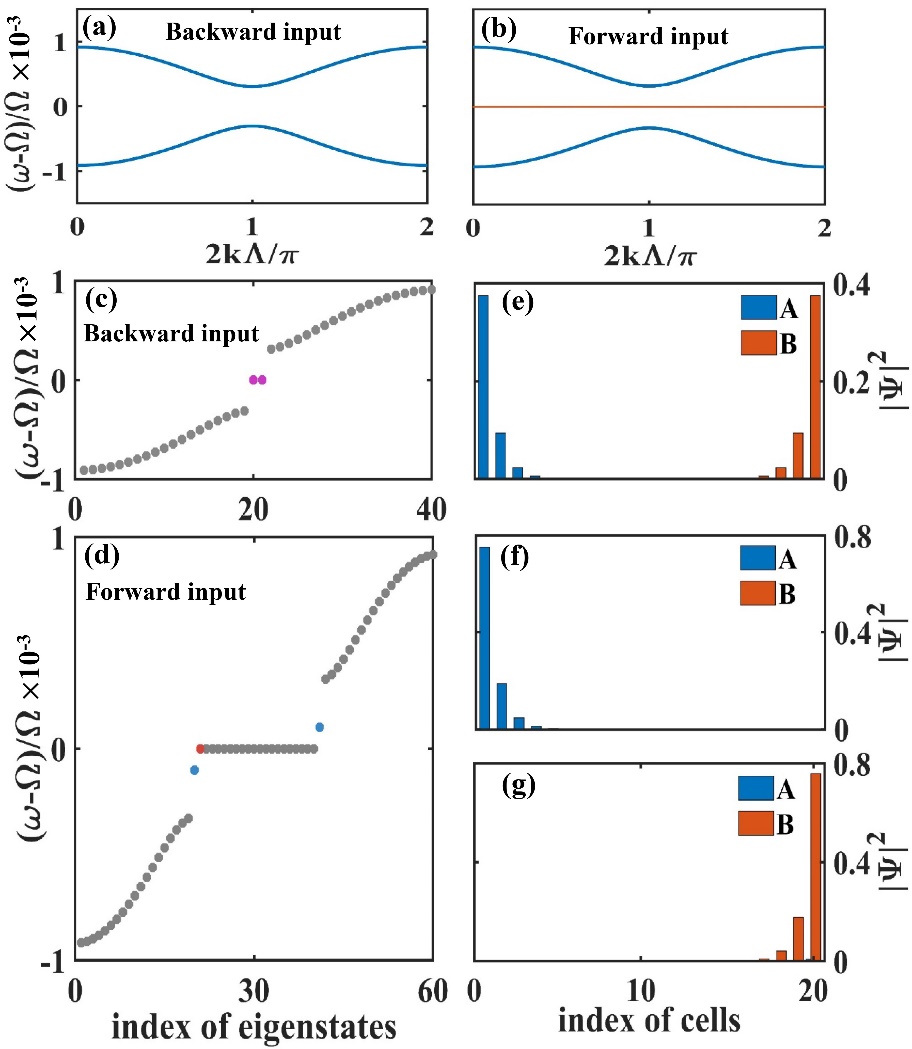 2 (a, b) 非互易能带结构,其中(a)对应反向激发(b)对应正向激发;(c, d)非互易能谱,其中(c)对应反向激发,(d)对应正向激发;(e-g)边界态元胞概率分布,其中(e)对应反向激发,(d, e)应正向激发。