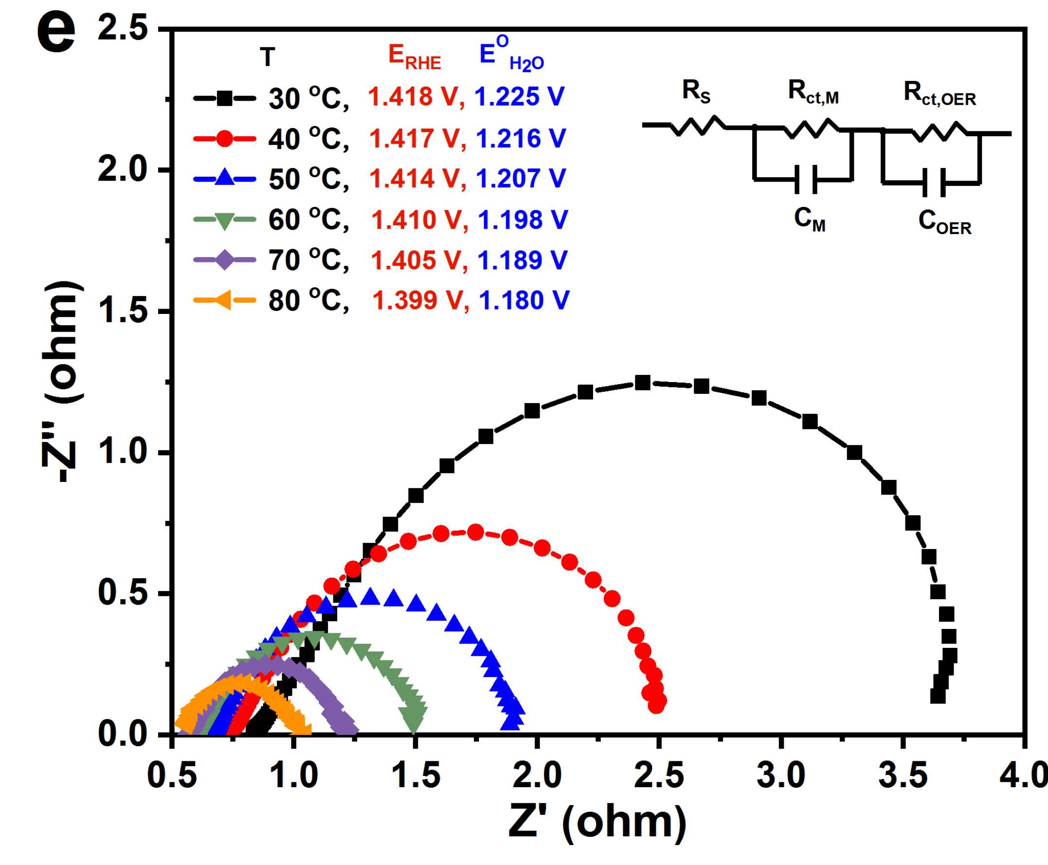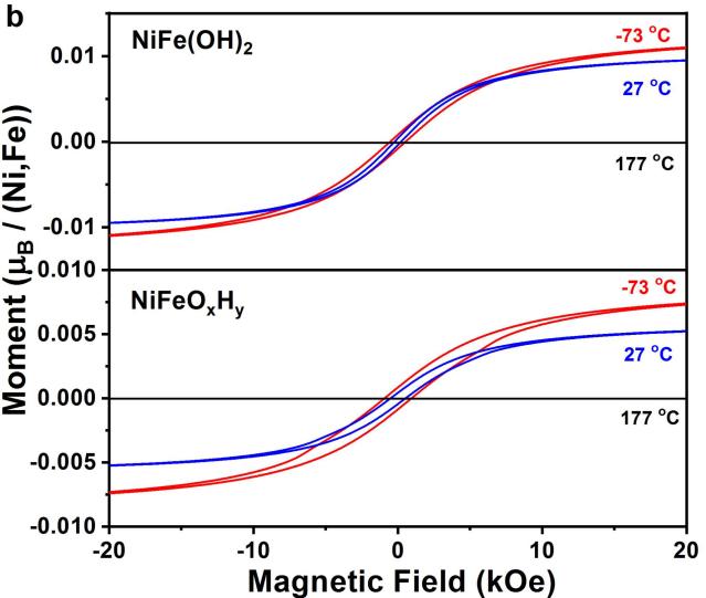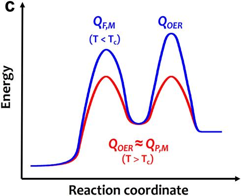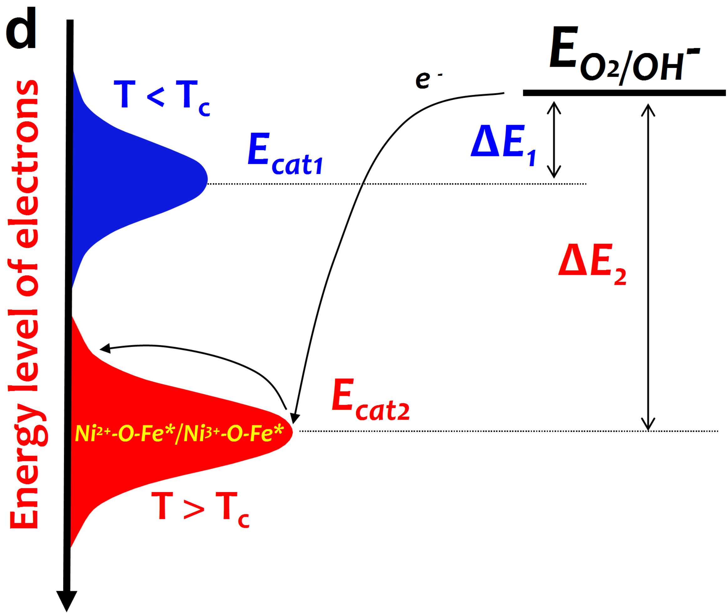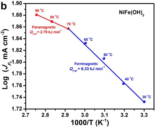 针对以上问题,课题组在对多能耦合制氢研究积累的基础上 (J. Am. Chem. Soc. 2021, 143, 9236; Frontiers in Chemistry, 2022, 10, 902814; J. Phys. Chem. Lett. 2022, 13, 49),提出基于热致物理效应实现高效热-电耦合的可再生能源制氢材料设计理念。以NiFeOxHy (NiFe(OH)2NiFeOOH的混合物相)电催化剂作为模型催化剂,基于其较低居里温度Tc70 ?C)设计出一种高效的热-电耦合水分解体系。磁学特性测试研究表明,NiFeOxHy电催化材料在70 ?C发生亚铁磁→顺磁相变(图2a-b),实现了顺磁态的Ni2+/Ni3+氧化和Ni3+氧化水反应,因此有效降低了电子转移势垒,在90 oCNiFeOxHy的水氧化电流密度达到100 mA cm-2时的电极电位仅为1.392 V。基于热致磁相变的热-电耦合反应中,热不仅仅促进传质过程(Arrhenius方程描述的线性热-电耦合关系),同时也是维持材料电子态的重要参量,因此改变了电子转移势垒并诱发活化能突变(3a-c)。如图4a所示,NiFeOxHy的亚铁磁-顺磁转变对低品位热较为敏感,从而使Ni2+Ni3+的氧化具有较低的电子转移势垒。在此过程中,热贡献于电子自旋翻转,有效代替了电力消耗。此外,在顺磁态,低自旋Fe3+具有更多的电子转移通道,更加有利于Fe-O-Ni构型的电子交换相互作用,从而在Ni2+/Ni3+氧化和OER过程中实现高效的电子转移,并以几乎相同的KMKOER显著加速氧化还原电对媒介的水氧化反应(图4b)。