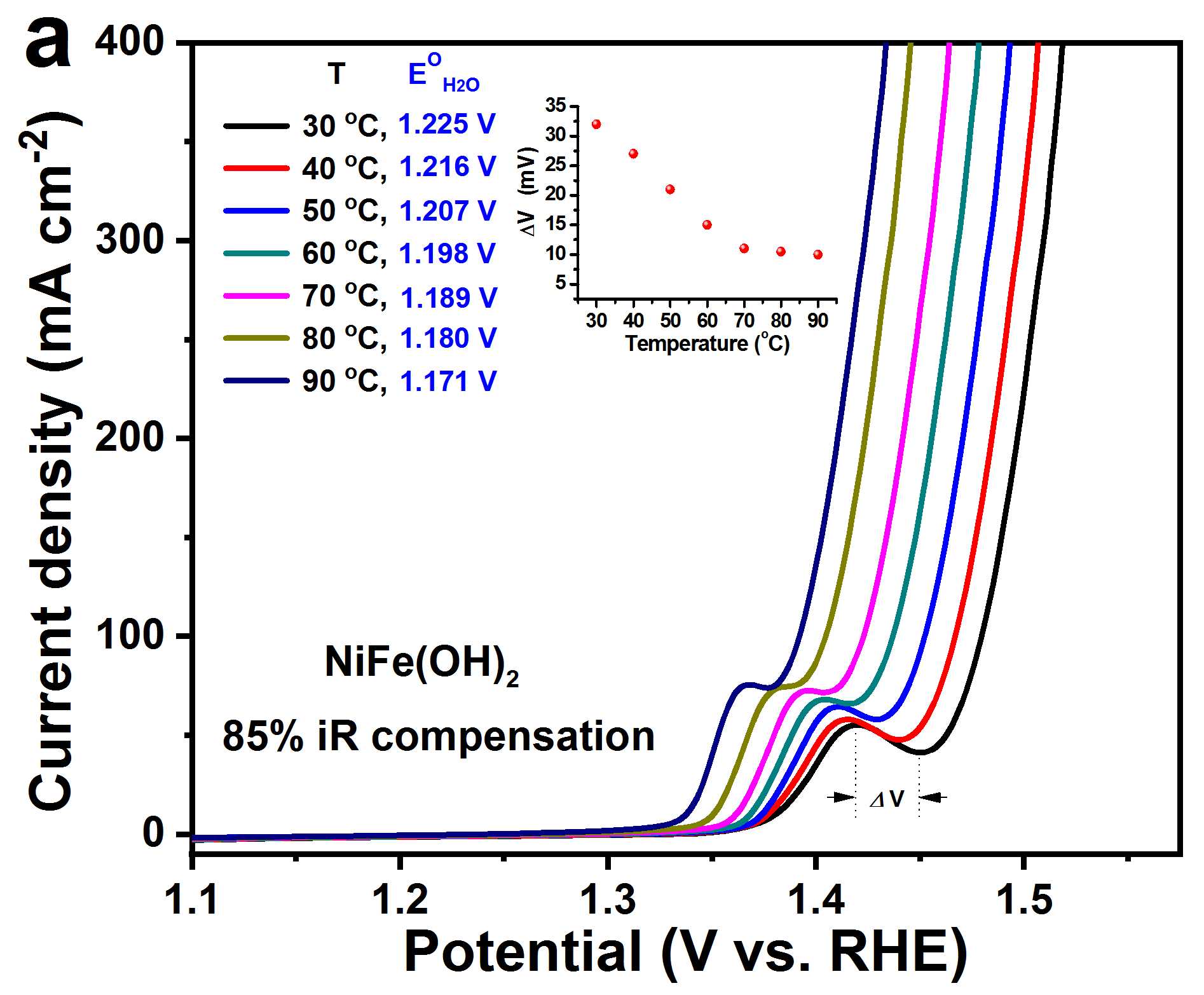 能量之间的耦合增益效应是实现能量转换效率最大化的一种潜在途径,但仍需要探索能量耦合增益的物理机制和材料基础。对于电化学水氧化(OER)反应来说,电子是能量转换的载体,电子化学势的高低决定了能量转换的难易。因此,只有当体系内能量共同改变电子化学势时才能实现高效的能量耦合增益效应。在电化学水氧化极化曲线中,离子氧化Mm+/Mn+ (M< N)电位与OER的之间存在较大电势差(ΔV),表明离子氧化还原电对的离子氧化(速率常数,KM)与水氧化(速率常数,KOER)的动力学差异较大,因此通过加速KMKOER最小化ΔV(图1a)是加速水分解动力学的一种有效途径,即在氧化还原电对发生氧化后,水氧化反应即刻发生,不存在动力学延迟,此时OER的开启电位即为氧化还原电对的氧化电位(图1b)。以往的OER催化材料设计以调控催化材料电子结构降低电子转移势垒为主要指导思想,研究者提出了包括电子占据态、交换作用、材料结构、晶体场效应等物理参数来描述催化材料的OER催化性能。而实际的电解水反应存在多种物理场(电场、热场、化学场、力场等)耦合作用,其中最主要的是化学反应不可逆热和电之间的耦合效应。引入外部热使得电解池在更高的温度运行,不仅可以实现快速启动,且可降低水分解的理论需求电位,有利于降低反应势垒,从而降低化学反应热,实现快速响应电压波动,提升低电压下的水分解效率。因此热-电耦合是潜在的高效可再生能源制氢方案。