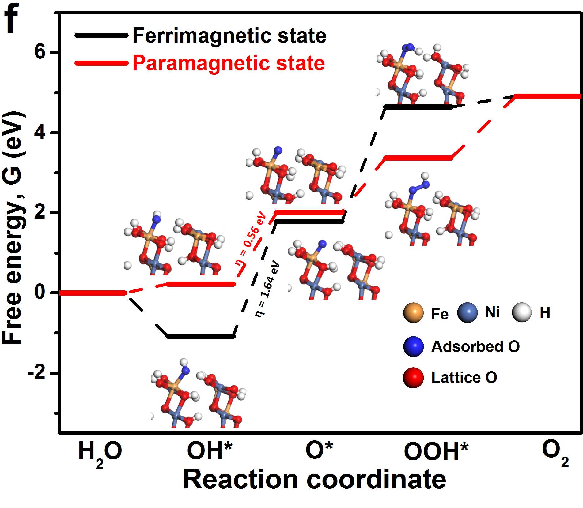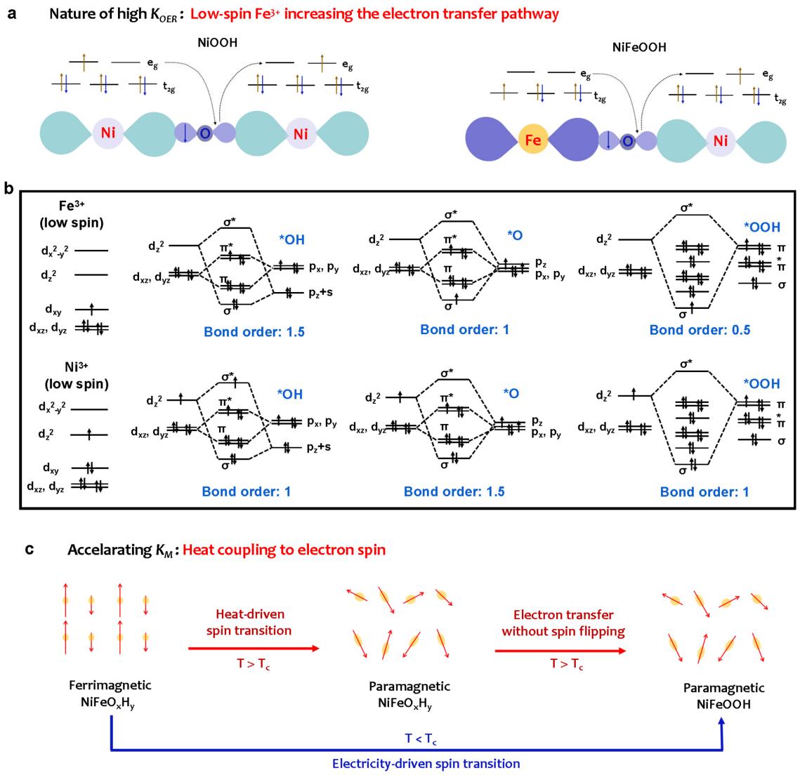 4. -电耦合的物理基础 (a) 低自旋Fe3+通过增加电子转移途径显著提升了OER的质子耦合的电子传输过程。(b) 顺磁态Fe3+符合高效OERSabatier催化原理。(c)热致磁相变使得热作为控制材料电子态的重要参量,有效参与电子化学势改变和降低电子转移势垒。