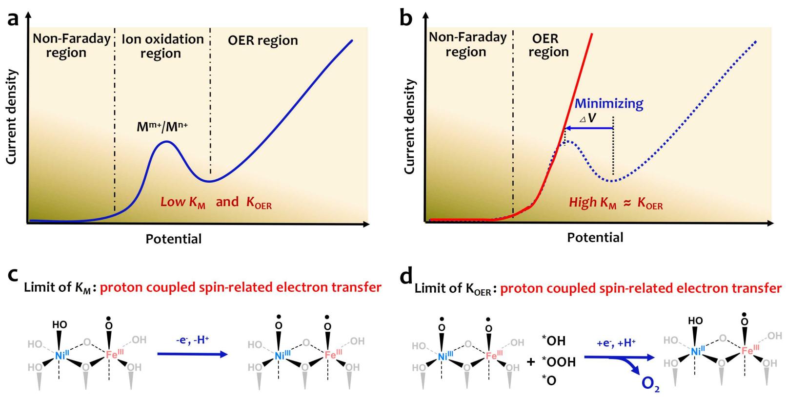 图1a-b)实际和理想情况下以氧化还原电对为媒介的OER电催化剂上的电流-电压极化曲线,其中KM表示氧化还原电对的氧化速率常数,KOER表示OER速率常数,(c-d)镍铁基磁性OER电催化剂的KMKOER动力学受限起源示意图,二者动力学受到质子耦合自旋相关电子转移(Proton-coupled spin-related electron transfer, PCSRET)的势垒限制。