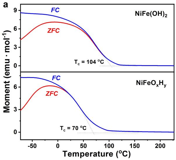 2. a)外加磁场强度H500 Oe下,NiFe(OH)2NiFeOxHy的零场冷却(ZFC)和场冷(FC)磁化强度随温度的变化函数,(b)不同温度下的M-H磁滞回线。