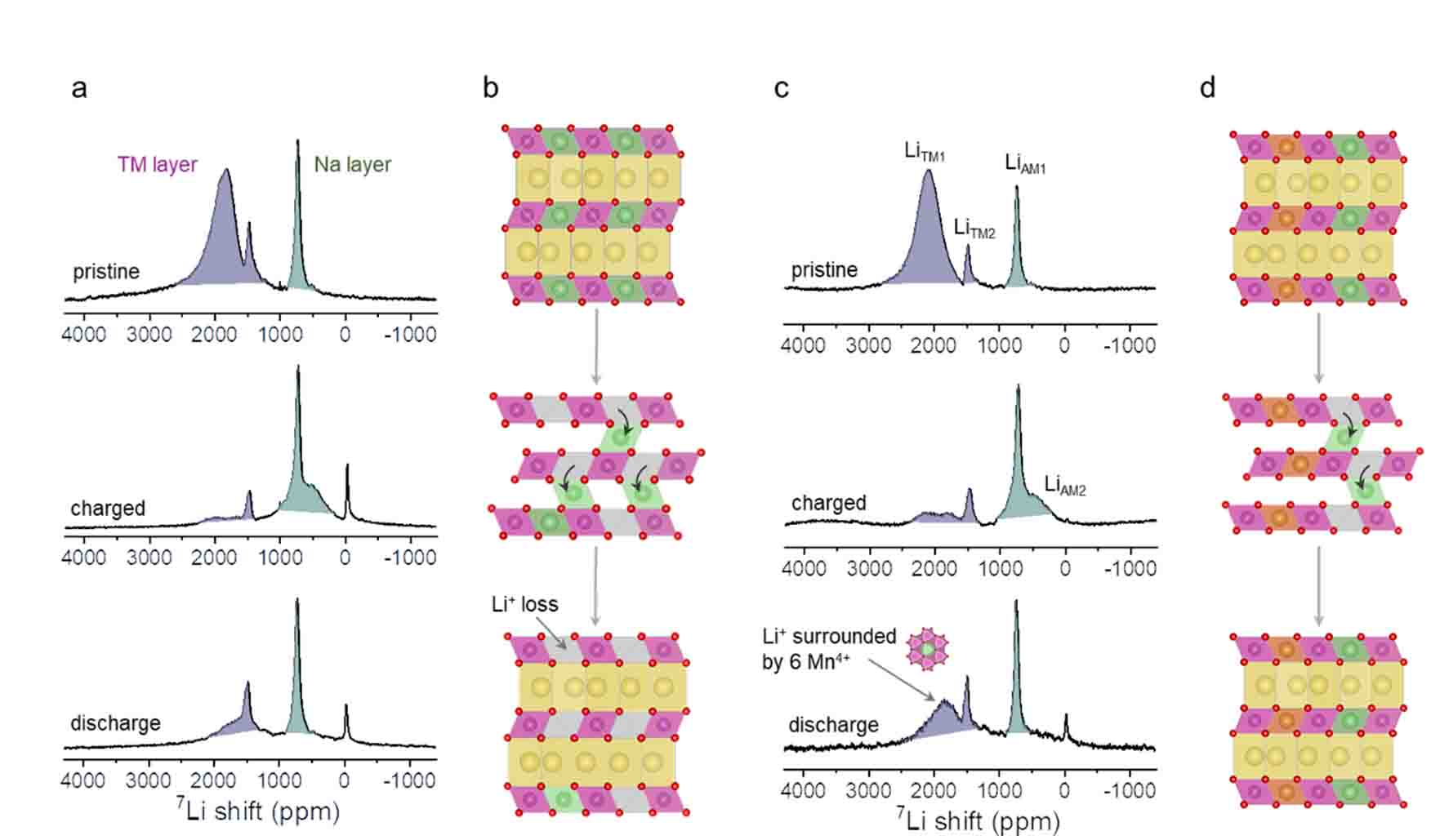 LiMn6-MgMn6材料中,[Li1/7Mn5/14]超晶格单元激活了晶格氧氧化还原活性,使得正极材料在首圈放电表现出285.9 mA g-1的可逆容量。密度泛函理论(DFT)计算、X射线吸收光谱(XAS)X射线光电子能谱(XPS)测试表明O参与了氧化还原反应。[Mg1/7Mn5/14]超晶格单元有利于结构和阴离子氧化还原的可逆性,在高度脱钠的状态下,Li+TM层中迁移至Na层,Mg-6Mn超晶格起到支柱作用,防止了空位团簇、氧气析出和结构破坏,从而保持了良好的结构可逆性;在1C (100 mA g-1)电流密度下循环50圈后保持了85.5%的容量。原位X射线衍射(XRD)也显示了其良好的结构可逆性。核磁共振(NMR)测试表明Li+可逆地穿梭于Na层和过渡金属层之间,与Na0.78Li0.26Mn0.74O2形成明显对比。