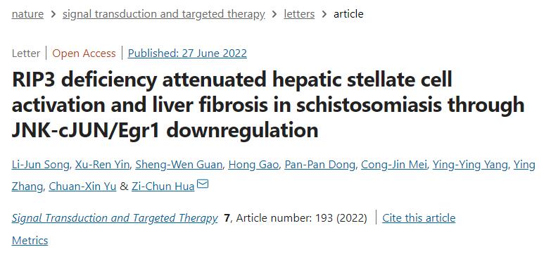 该研究团队前期还细致比较了两种经典的血吸虫感染致肝纤维化模型与四氯化碳致肝纤维化模型的肝脏炎症和免疫反应动态进展的差异,研究工作发表在Frontiers in Immunology, 2020 Oct 7; 11:570524。该研究成果Signal Transduction and Targeted Therapy2021JCR期刊IF排名第67)发表最新研究成果"RIP3 deficiency attenuated hepatic stellate cell activation and liver fibrosis in schistosomiasis through JNK-cJUN/Egr1 downregulation"。