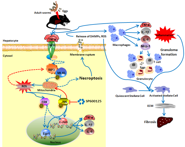该研究进一步应用JNK抑制剂SP600125治疗后血吸虫感染小鼠结果表明,血吸虫感染小鼠肝脏中虫卵肉芽肿和纤维化的程度降低,肝脏中炎症因子和ROS的水平下降。研究揭示RIP3在血吸虫病肝脏纤维化中的重要作用,RIP3缺乏可降低血吸虫病肝脏纤维化的程度。体内、外实验证实RIP3-JNK-cJUNEgr-1轴正反馈调控炎症因和ROS的产生,激活肝星状细胞,释放细胞外基质,促进血吸虫病肝纤维化。RIP3及其下游的信号通路可作为血吸虫病肝纤维化的药物靶点