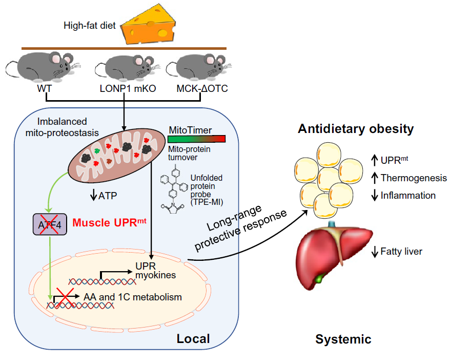 骨骼肌是人体最大的糖脂代谢和内分泌器官,骨骼肌糖脂代谢及其与其他器官之间的代谢交流在机体代谢稳态维持中起着至关重要的作用。线粒体对骨骼肌代谢功能至关重要,骨骼肌线粒体需要精细的、多层次的质量监控系统来保障其功能。此前,甘振继教授课题组揭示了骨骼肌线粒体自噬通路在调节骨骼肌线粒体功能以及机体代谢稳态中起着至关重要的作用,发现了骨骼肌代谢调控中不为人知的“线粒体自噬调控肌肉-脂肪间的代谢交流”的重要作用模式。在此研究基础上,该课题组进一步探索骨骼肌线粒体质量控制的第一道防线——线粒体蛋白质稳态控制对肌肉代谢的影响。尽管线粒体UPRmt 在线虫中已经被广泛研究,但在哺乳动物体内的作用机制和生理功能仍不清楚。针对这一难题,作者综合应用了体内线粒体蛋白周转Mito-timer报告系统、未折叠蛋白化学小分子探针高通量转录组/代谢组、基因敲除/转基因等遗传操作方法进行系统研究。发现骨骼肌线粒体蛋白酶LONP1的缺失可导致线粒体蛋白周转减缓,引起骨骼肌线粒体形态和功能异常。然而出乎意料的是,骨骼肌特异性的LONP1敲除小鼠显著抵抗高脂饮食诱导的肥胖,胰岛素抵抗和肝脏脂肪变性为了确证线粒体蛋白质稳态控制与高脂饲喂诱导的肥胖之间的机制关联,作者还构建了另一种转基因小鼠模型,在肌肉中特异性过表达一种线粒体驻留的错误折叠蛋白——突变形式的鸟氨酸转氨甲酰酶(ΔOTC)。该转基因小鼠也展现出与LONP1肌肉缺失小鼠类似的整体代谢改善表型。进一步通过高通量的转录组学分析发现,骨骼肌中线粒体蛋白稳态失衡激活了UPRmt,介导了肌肉与脂肪及肝脏间的长距离交流,促进了高脂状态下脂肪和肝脏的代谢改善。此外,为了进一步探究骨骼肌UPRmt的机制,作者通过转录组学及代谢组学的联合分析,并结合骨骼肌特异性LONP1和转录因子ATF4双敲除的小鼠模型,系统阐明了骨骼肌线粒体UPRmt的作用模式。简言之,骨骼肌线粒体UPRmt通过ATF4通路调控肌肉氨基酸代谢和一碳代谢,而通过ATF4非依赖的方式长距离调节整体代谢稳态。