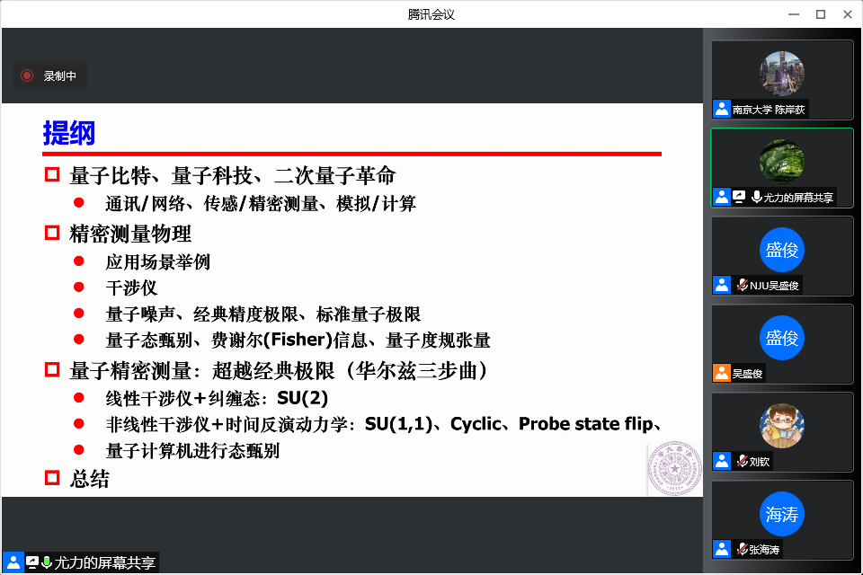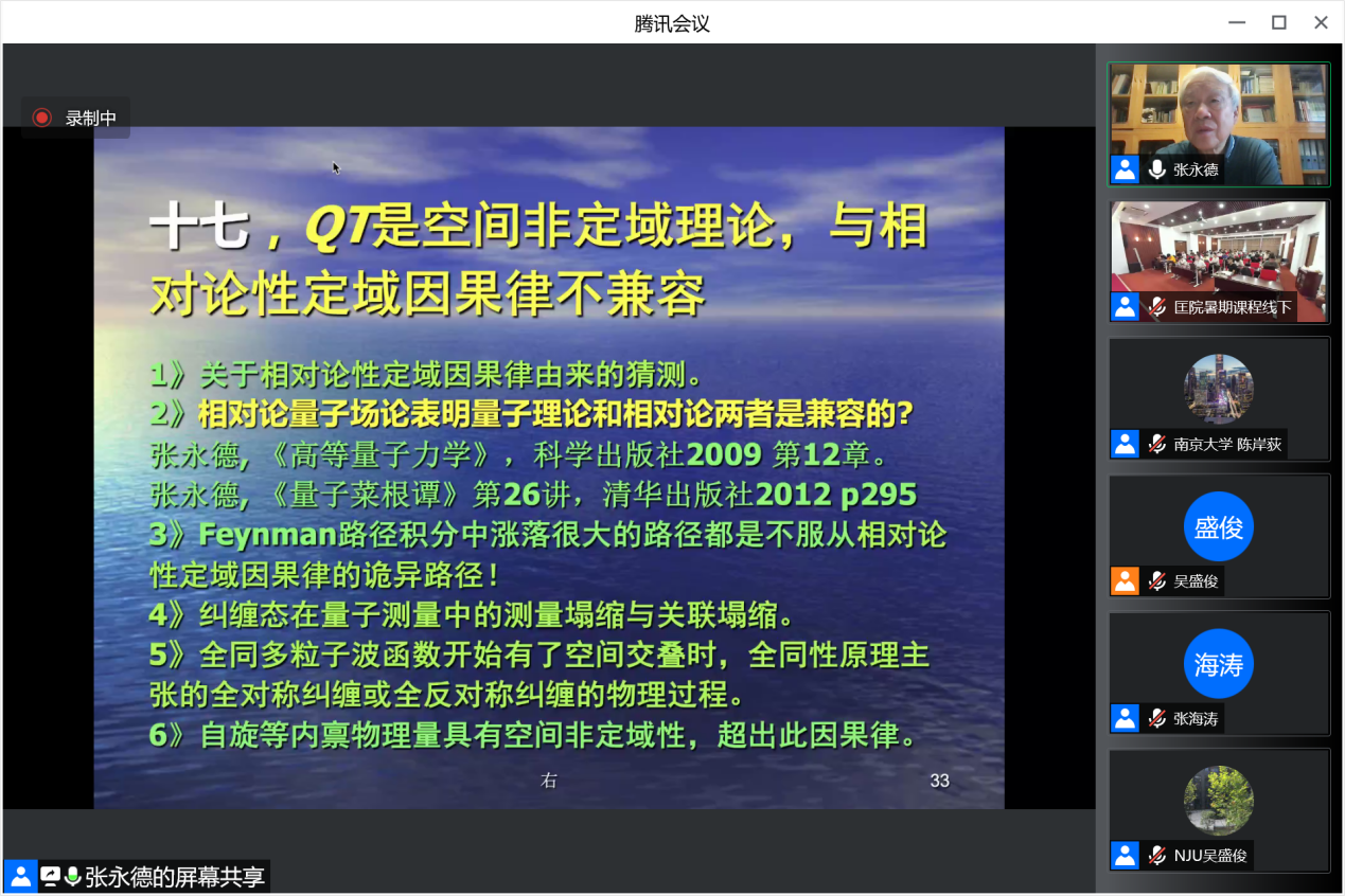 基础课程部分由该项目的负责人吴盛俊教授主持。奥地利科学院通讯院士、全国高校量子力学研究会名誉理事长、中国科学技术大学教授张永德先生开启了讲习班的基础课程,他主讲的《量子力学疑难争论问题概论》一共6节课,系统阐述了量子力学理论上的疑难问题,从一个全新的高度开启学员对量子计算的基础—量子力学—基本问题的思考。