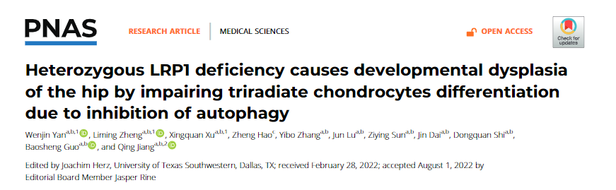 202296凯发k8官网医学院蒋青教授团队在《美国国家科学院进展》(PNAS杂志上在线发表最新研究成果 "杂合性Lrp1缺陷通过抑制自噬影响Y形软骨分化导致发育性髋关节发育不良(Heterozygous Lrp1 deficiency causes developmental dysplasia of the hip by impairing triradiate chondrocytes differentiation due to inhibition of autophagy)"凯发k8官网医学院蒋青教授、郭保生副教授文章的共同通讯作者凯发k8官网医学院附属鼓楼医院严文津博士和凯发k8官网医学院博士生郑力铭该文章的共同第一作者该研究得到了国家自然科学基金项目(批准号:82172379819021748199151481420108021资助