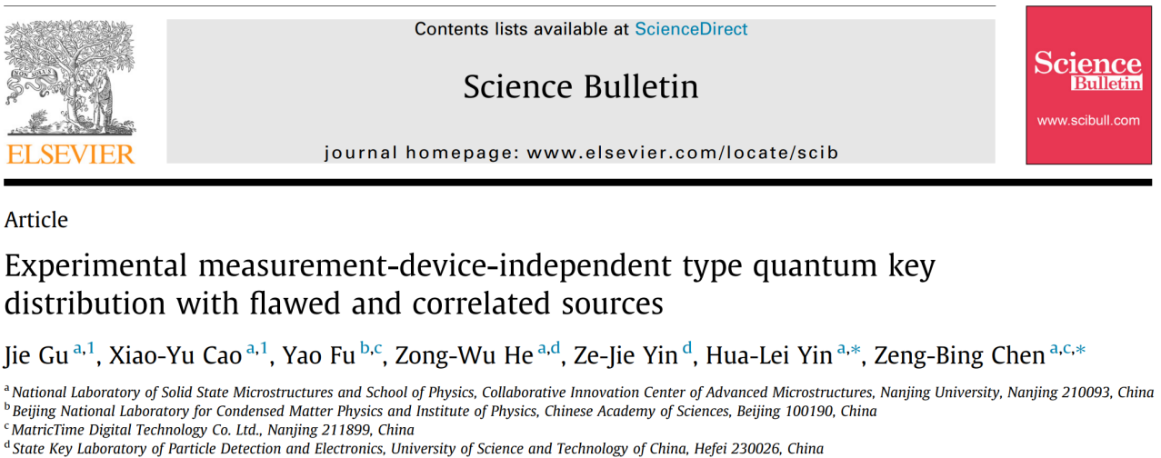 相关研究成果以"Experimental measurement-device-independent type quantum key distribution with flawed and correlated sources"为题于2022年11月15日发表在Science Bulletin期刊【Science Bulletin 67, 2167 (2022)】上。论文共同第一作者为凯发k8官网物理学院硕士研究生顾杰和博士研究生曹啸宇,通讯作者为凯发k8官网尹华磊副教授和陈增兵教授。该研究工作得到江苏省自然科学基金、中央高校基本科研业务费、凯发k8官网江北新区重点研发计划等的支持。