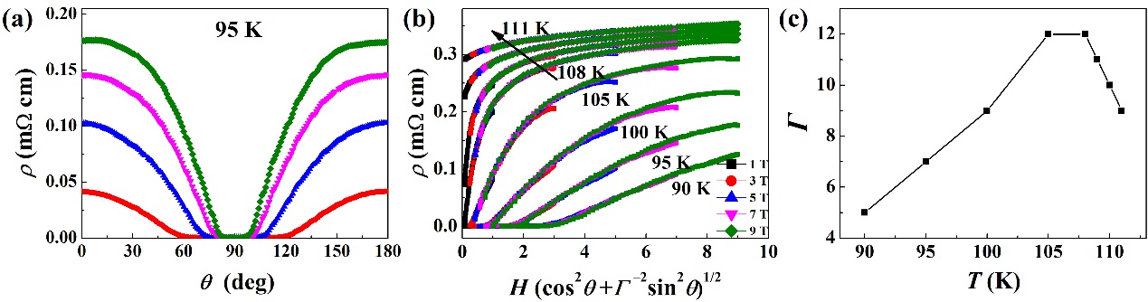 图1. (a) (Cu,C)-1234单晶在95 K时不同磁场下的转角电阻测量结果。(b) 用标定法对转角电阻进行拟合的结果。(c) 单晶的各向异性度随温度变化曲线,揭示较小的各向异性度。