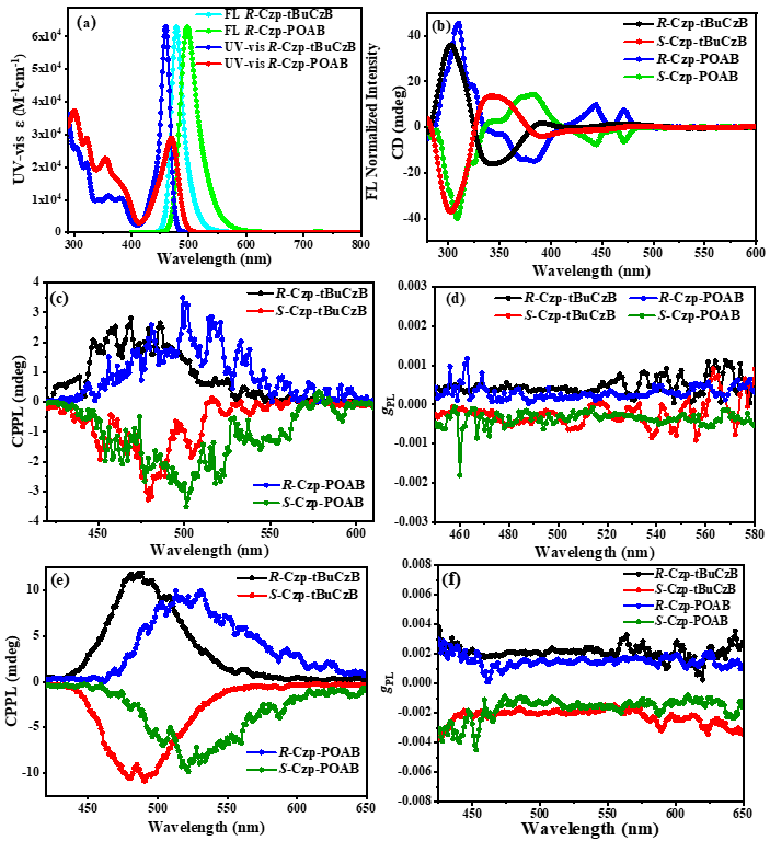在本工作中,化学化工学院郑佑轩教授和郑文华副教授团队将[2.2]对环(1,4)咔唑啉(Czp)引入到基于叔丁基和酚恶嗪的硼氮多重共振体系中,合成了两对具有平面手性的CP-MR-TADF对映体 (R/S)-Czp-tBuCzB(R/S)-Czp-POAB。由咔唑、吩恶嗪和其他基团组成的刚性结构与苯基上的硼原子以特定方式排列,有利于实现S1T1之间小的能隙EST)和窄的发射光谱。其在甲苯中的发射峰值分别为478497nmFWHM分别为2336nm,掺杂膜中的光致发光量子产率分别高达98%93%。基于(R/S)-Czp-tBuCzBCP-OLED的电致发光(EL)光谱半峰宽仅为24 nm,最大外量子效率达到32.1%,当亮度达到1000 cd/m2时,效率滚降仅为3.7%,这在蓝光CP-OLED中是最小的。而基于(R/S)-Czp-POAB的器件显示了基于CP-MR-TADF材料的第一个近纯绿色的CPEL,发射峰为513 nmCIE坐标为(0.230.65)。两种CP-OLED都显示出对称的CPEL光谱,|gEL|因子分别为1.54×10-31.30×10-3