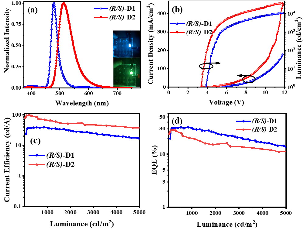 有机发光二极管(OLED)在现代生活中得到了广泛应用,而通过圆偏振发光(CPL)可以实现下一代圆偏振OLEDCP-OLED)和3D显示。高性能CP-OLED具有直接产生可调谐发射的CPL、简单的器件结构和高效率的优点,使其成为3D显示最可行的策略之一。在过去几年中,手性荧光材料包括聚合物和小分子、手性磷光金属配合物和手性热激活延迟荧光(TADF)材料都被应用于CP-OLED中。由于单重态(S1)和三重态(T1)激子都可以通过反向系统间交叉(RISC)过程获得利用,器件具有较高的性能,而无需贵金属的特点,手性TADF材料备受关注。然而,传统手性TADF材料的发射光谱较宽(FWHM > 60 nm),使得实现超纯彩色发射变得困难。