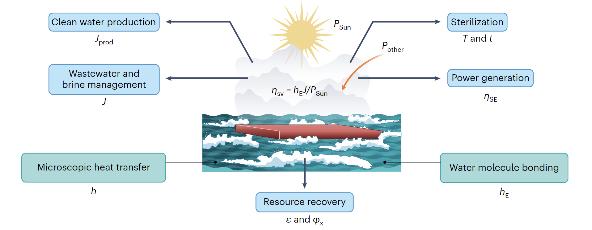 图1. 太阳能蒸发典型应用的关键指标。在能量效率(ηSV)之外,不同应用的关键指标包括:水收集速率Jprod(淡水获取)、蒸发速率J(污水与卤水处理)、回收率?以及纯度φx(资源回收)、蒸汽温度T以及接触时间t(蒸汽灭菌)、太阳能到电能的转换效率ηSE(电能产生)。基础层面,微观热传输和水分子间相互作用与蒸发性能息息相关,需要进一步探索。太阳能(Psun)之外,其它形式的能量(Pother)也可加速蒸发过程,亦需关注。