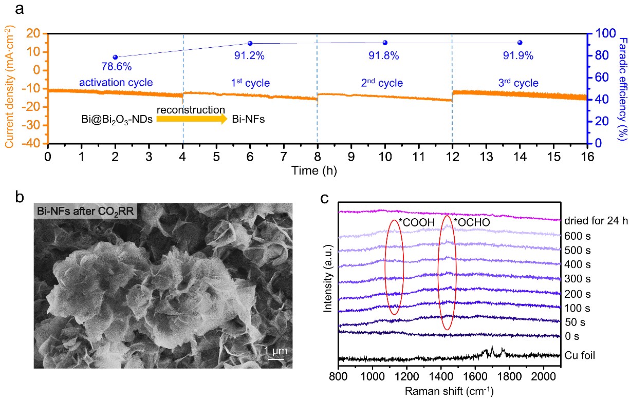 通过对比裸铜箔、Bi@Bi2O3-NDs和Bi-NFs的各方面电化学性能,可判定Bi-NFs在经过原位重构后得到了更低的阻抗、更大的电化学活性面积以及更多的活性位点,进而使得电催化CO2转化为甲酸的选择性获得大幅提高(图4)。最后,将生长了Bi@Bi2O3-NDs的电极片用于长时间的CO2电还原稳定性测试。在首圈中,Bi@Bi2O3-NDs尚未完成原位重构过程,缺乏对应的活性位点和电化学性能,故而甲酸的法拉第效率偏低。而重构成为Bi-NFs后,甲酸的法拉第效率大幅提高,并且能维持16小时的稳定(图5a)。这种Bi-NFs的形貌在长循环后也仍能得到保持(图5b)。此外,通过原位拉曼光谱,可判明在CO2还原过程中,*OCHO中间体的稳定起到了关键性作用(图5c)。结合XPS证据,可判断出原位重构的Bi-NFs具有丰富的Bi0活性位点,起到了对*OCHO中间体的稳定吸附作用,进而保证了甲酸的转化路径,最终提高了电催化的选择性。
