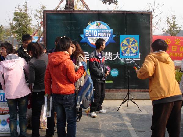 19号中午,食堂门口围聚着一大群人,工作台上三四台笔记本一字排开,几位男生正热心地回答围观同学的问题,一些同学正在指导下填写表格,一些同学在玩游戏:猜题,扔飞镖,抽奖,忙的不亦乐乎……背后是一个大展板,上面写着“2010QQ电脑管家校园行电脑安全大检查”。这里就是腾讯俱乐部校园小管家活动现场。