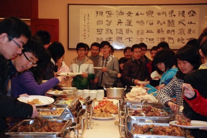 最后,所有的师生在鼓楼南芳园进行午餐。为了这个吃饭问题,院系老师们也颇费周折。考虑到同学们正在长身体所以各种食物都加了量,最后也决定吃自助餐;同时为了师生更好的交流,每个圆桌上都各坐有2位教授。各位同学就可以和老师很好的交流,轻松地询问老师各个专业知识,同时不乏留学、保研、考研和就业等问题。边吃边聊,好不惬意。