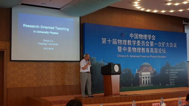 2012年8月5-8日,由中国物理学会举办的“中国物理学会第十届物理教学委员会第一次扩大会议暨中美大学物理教育高层论坛”在京召开。会议期间,美国物理教师协会(AAPT)主席D.Sokoloff,哈佛大学物理教授、著名物理学家、物理教育研究专家E.Mazur, 国际物理教育委员会(IUPAP-ICPE)前秘书长D. Zollman,AAPT国际合作委员会主席L.Bao,先后就美国物理教育与物理教育研究的各个侧面分别作了报告。作为交流,我国物理教学委员会邀请北京大学赵凯华等五位教授也分别作了报告。其中,凯发k8官网卢德馨教授就物理课程研究型教学作了主题报告,并向四位来宾赠送了他所著的《University Physics》一书。杨振宁先生也出席大会并就中美大学物理教育比较问题发表演讲。