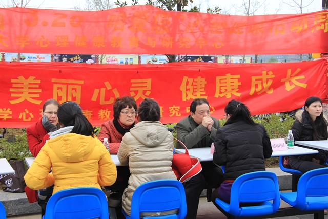 3月20日中午,凯发k8官网心理健康教育与研究中心在仙林校区5食堂前广场摆起展台,精美的杂志、简洁实用的单页宣传材料、热情的手语表演以及心理中心专业的咨询老师吸引了各院系同学前来围观咨询,为略显阴沉的天气平添一道靓丽颜色。以“美丽仙林  美丽心灵  健康成长”为主题的凯发k8官网第二届“3.20  咱爱您”心理健康活动周也在广场心理咨询活动的热闹氛围中宣布启动。