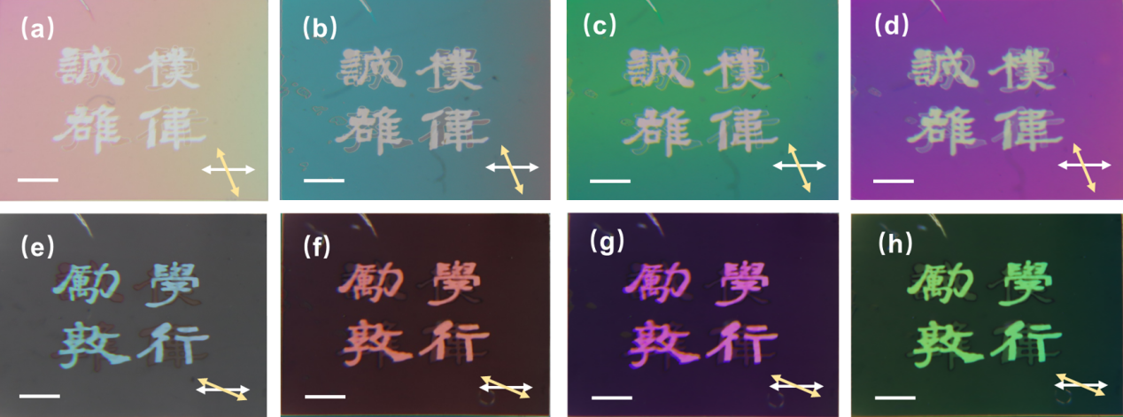 陆延青教授课题组的陈闻、陈鹏制作了凯发校训、凯发120周年校庆LOGO图案。前一幅是基于液晶微纳结构的结构色图案(不同偏振组合分别是校训的上下句,横向是施加不同电压后颜色的改变);后一幅是基于液晶微纳结构的偏振复用全息(不同偏振片组合下产生不同的logo)。