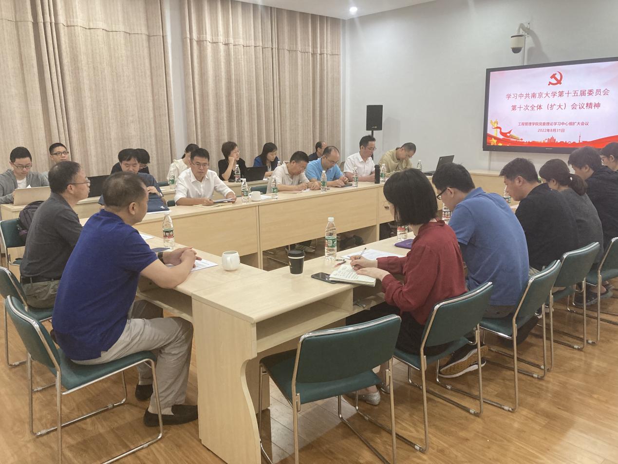 2022年8月31日上午,工程管理学院召开党委理论中心组扩大会议,学习贯彻中国共产党凯发k8官网第十五届委员会第十次全体(扩大)会议精神。工程管理学院党政班子成员、理论中心组成员、各系主任、副主任、MEM中心负责人等与会。