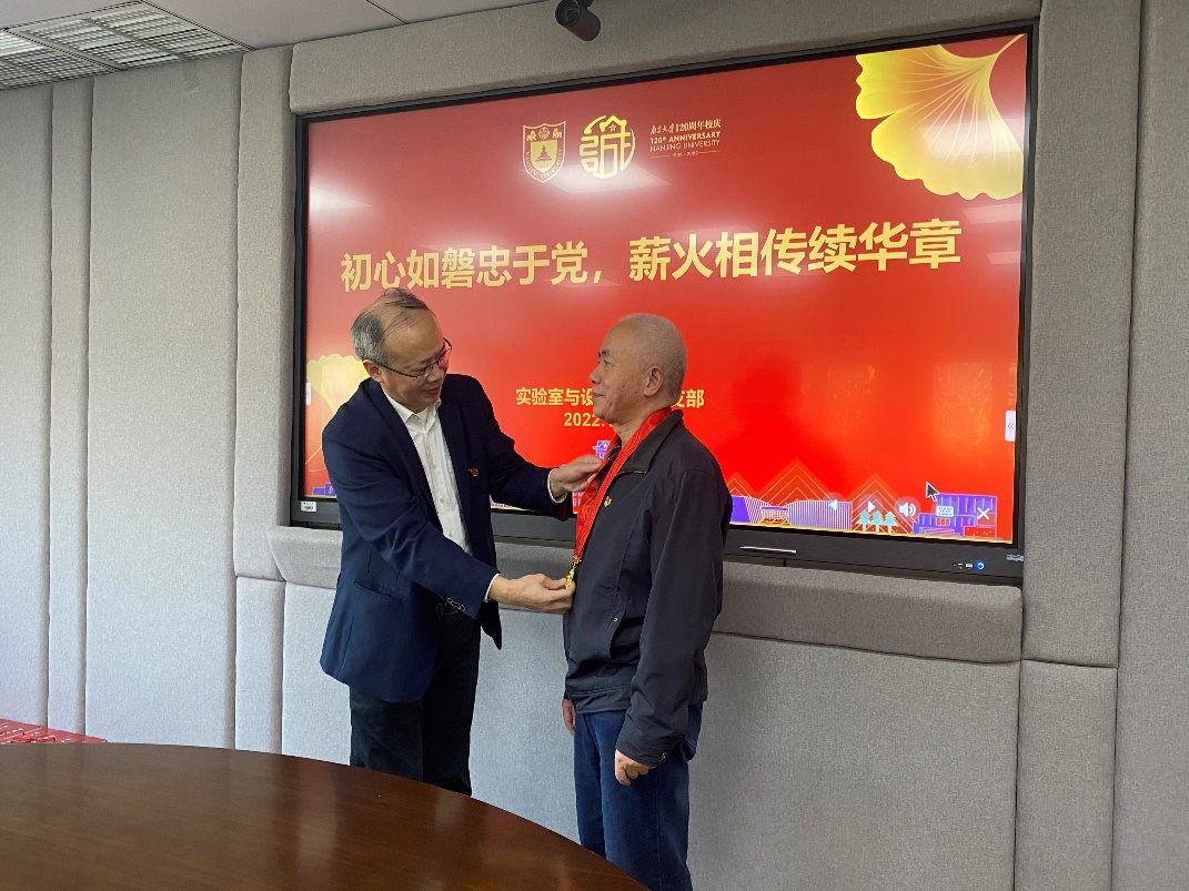 会上,支部书记董林向所有退休老同志致以重阳问候,并作了2022年上半年支部工作汇报。他指出,当前我们面临的新时代、新局面,取得的新成绩、新进步,都离不开中国共产党的正确指导,也离不开老同志们的无私奉献,为我们打下了良好基础。接着,他代表支部向陈大鹏同志授予"光荣在党五十年"纪念章,青年党员代表晏旭秀、南盼盼、李梅映、宋晨海上台献词。