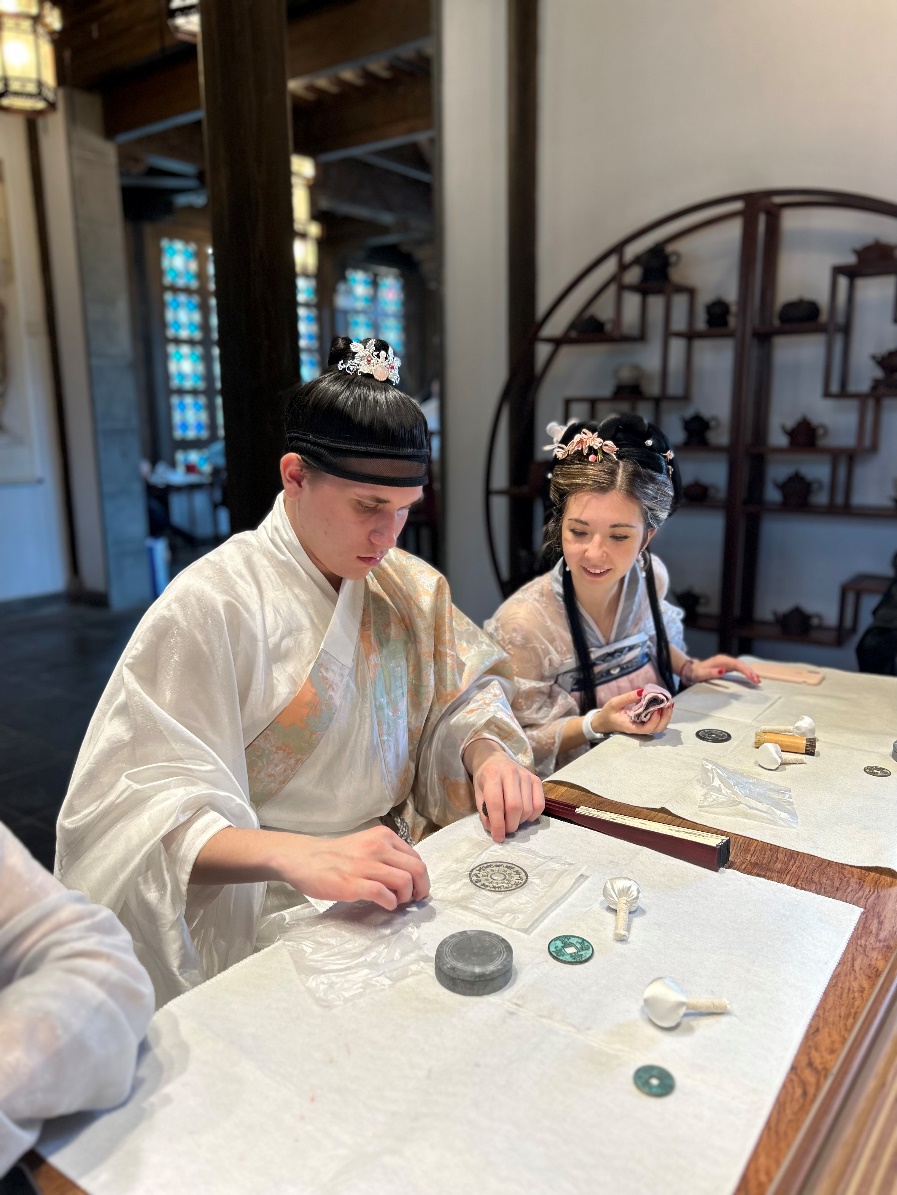 11月12日,由凯发k8官网海外教育学院、江苏国际文化交流中心和凯发k8官网市秦淮汉服文化协会主办的"丝幔摇曳靓金秋,衣袂飘然会愚园——外籍人士体验汉服及非遗文化活动"在愚园举行。我校来自英国、德国、俄罗斯、智利、乌克兰、泰国、刚果(布)、越南、乌兹别克斯坦、马来西亚、韩国等11个国家的国际学生齐聚愚园(又称"胡家花园"),大家穿戴汉服,游园弹琴品茶,体验拓印技艺,沉浸式体验了中国古代传统文化。