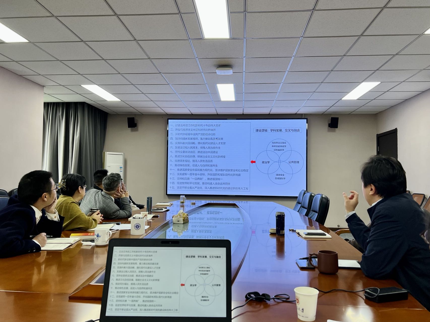 副院长张海波教授和政治学系主任王海洲教授分别作了发言。张海波教授作为新建的国家安全学学科负责人,交流了学习二十大报告中强调"国家安全是中华民族伟大复兴的根基",要"推进国家安全体系能力现代化"等内容的体会,认为在国家安全学研究中我校具有先发优势,在第一批试点的九所高校中我们具有较好的社会治理和应急管理的研究基础,近两年与环境、大气、人工智能等跨学科的交叉融合也有着成功的尝试,建议从学校的层面进一步统筹、整合校内资源,构建应急管理学科生态群,从而形成凯发特色的应急管理知识体系。王海洲教授对二十大报告的十五个部分从政治学、公共管理、马克思主义理论、国家安全等7个一级学科角度进行了分析,他认为,学科研究不应拘泥于学科自身自设的边界,应以问题为导向,从学科角度主动出击寻找可以发挥作用之处,要结合专业研究深度研读二十大报告精神;同时,促进跨学科交流发展,首先可以加强学院内政治学、公共管理、国家安全学三个一级学科的交叉融通,通过把握时代性脉搏立足前沿、独辟蹊径,找准优势学科新的发展方向和路径。
