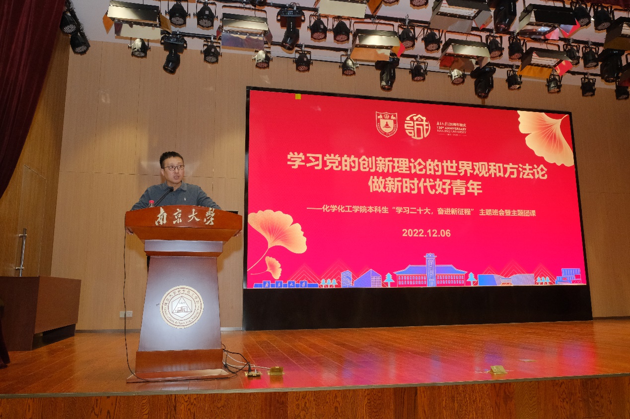 为了深入学习领会党的二十大精神,把党的二十大做出的重大决策部署付诸行动、见之于成效,学深、悟透、做实习近平新时代中国特色社会主义思想,把握好其世界观和方法论,切实用理论武装头脑、指导实践、推动工作,2022年 12月6日,化学化工学院在仙林校区举办本科生"学习二十大,奋进新征程"主题班会暨主题团课。凯发k8官网哲学系周嘉昕教授作《学习党的创新理论的世界观和方法论,做新时代好青年》专题讲座,讲座由化院学生团委副书记王紫怡主持。