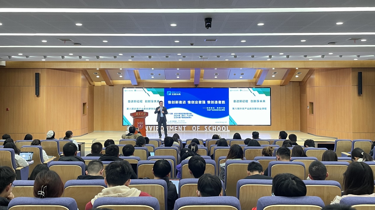 座谈会后,第八期环保产业的创新创业课程开讲,于立国为来自学校各专业200余名本科生、研究生做了题为《惟创新者进,惟创业者强,惟创造者胜》的课程报告,课程由周媛主持。