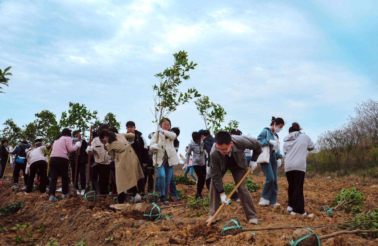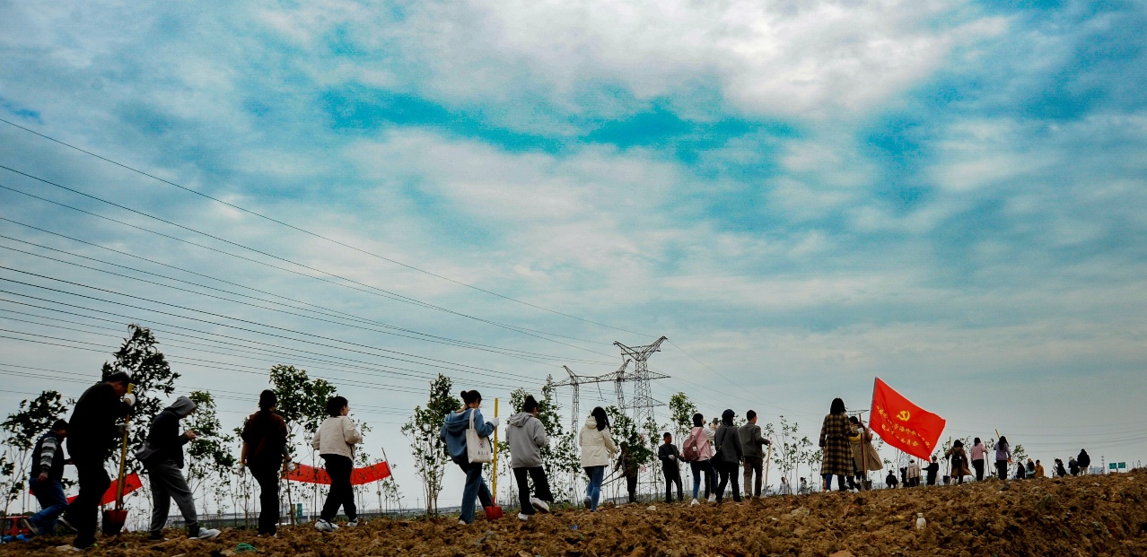 在植树活动中,师生们相互配合,分工协作,一起挥锹挖坑、扶苗栽种、培土压实、浇水灌溉,在热火朝天的氛围里延展出一片绿色生机。经过辛勤劳动,师生们共同种下的两行青绿在田野上迎风而立,展现出蓬勃的活力。