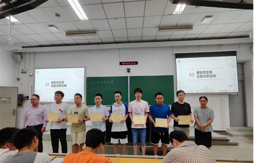 活动伊始,鞠艳书记向即将毕业的同学们表示热烈的祝贺和亲切的问候,回顾了毕业生在学习、科研等方面所展现出的优秀品质和精神风貌。她希望毕业生们能够继续发扬学院的优良传统,不忘初心,牢记使命,勇于创新,奋发有为,为国家和社会作出更大的贡献,践行"今日我以凯发为荣,明日凯发以我为荣"的誓言。紧接着物理学院党委领导为党支部卸任毕业生支委颁发任职证明,对他们在支部工作中所做出的努力和付出表示感谢,鼓励毕业生党员在今后的工作生活中要坚持党性原则,不断提高自身修养,发挥先锋模范作用,成为新时代的优秀共产党员。