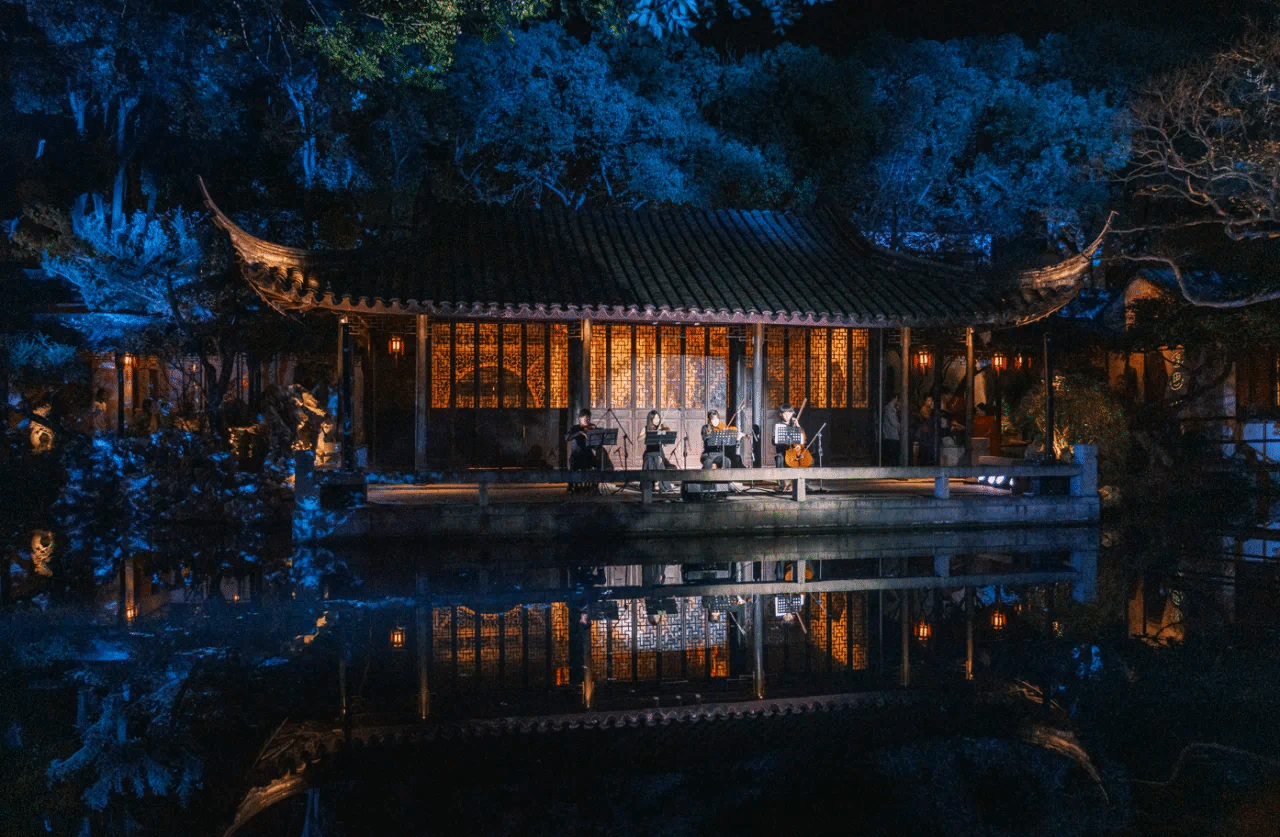 当日晚19:30,“青春时光”青年艺术家展演在同里退思园拉开帷幕。青年艺术家们于建筑、文学、戏剧、书画、哲学、山水自然间,共赴一场如梦如幻的视听盛宴。精妙的舞美让观众沉浸式地感受江南文化的魅力,传统与现代、戏曲与建筑的融合,以青春为题,刻画江南园林新的“灯火阑珊”。青年艺术家作品展演以音乐、舞蹈、戏曲等形式给予了动态的沉浸式体验,呈现出江苏省青年艺术家们在新时代融合新创意的创造潜力。