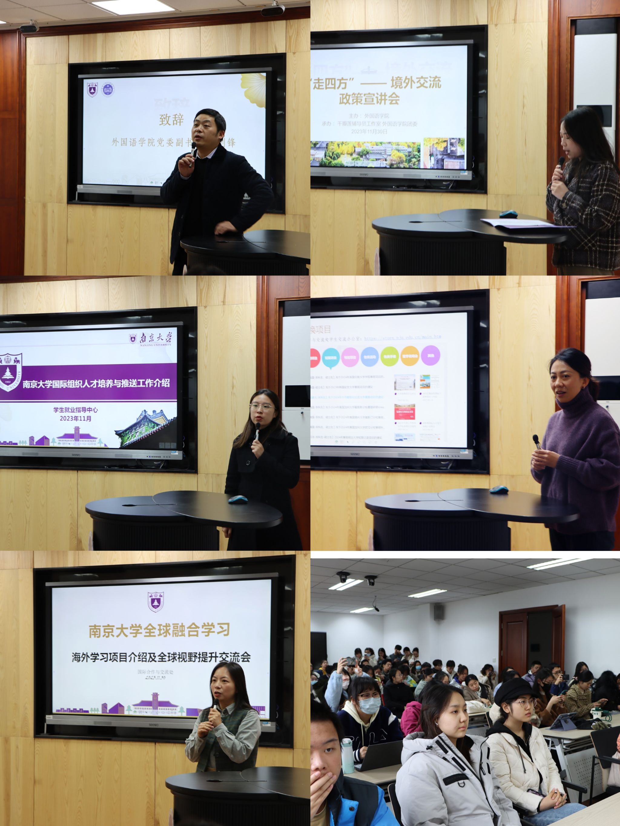 “走四方”系列活动第二场——境外交流政策宣讲会于11月30日中午在侨裕楼顺利举行。外国语学院党委副书记孔剑锋老师、国际处陈楠老师、本科生院苗佳丽老师,学生就业指导中心邓云艺老师出席活动,活动由外国语学院团委副书记龙心悦老师主持。来到本次活动现场的包括外国语学院、匡亚明学院、计算机系、数学系、文学院、商学院和秉文书院的各年级本科生。