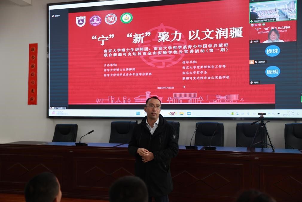 活动伊始,镇江援疆干部、镇江市学府路小学校长、新疆可克达拉市金山实验学校副校长蒋礼明就联合宣讲活动契机与安排进行了简要介绍。蒋校长希望同学们以授课讲师为榜样,志存高远、踏实求学,传承中华文脉、坚定文化自信,争做中华民族先进文化的继承者和弘扬者,并预祝本次云上课堂顺利举办。
